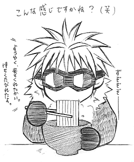 web拍手からのメッセージに対する返信絵です♪ (絵で返信してるのを他所で見て1度やってみたかったのだ…) デバイス日記2005年3月24日の『うどん啜ってるJ.B.を見てみたい。』が発端。 完璧超人みたいな人がへっぽこ庶民的な行動を取る姿…良くね? 某小池さんを参考に描きました(笑)。