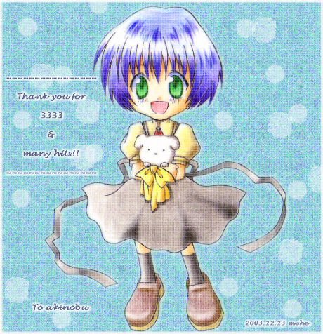 3333(とサークルHPで切番沢山)踏んだ今坂 彰展さんのリクエスト。 コレの前に没線画が2つも有るので「もう失敗は許されん!」と 少々ぶりっ子絵だったりゴニョゴニョ… 其れに相手が相手だしさ(笑)。 色鉛筆絵をCGっぽくしたかったんですけど、うぅぅ; で、何故か教頭にお褒めの言葉を戴いたブツ(ゎー)。