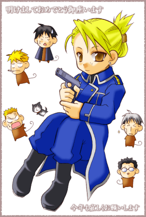 2004年の年賀絵です。 万人受けジャンル有難い。 前の年に幼馴染3人を描いたから、軍部にしてみました。 『リザと愉快な下僕達』なんて呼んでましたよ(笑)。ホーク愛! 干支は無理矢理入れました、犬が居て猿が居ないのはね。 こんななのに好評で嬉しい限りv