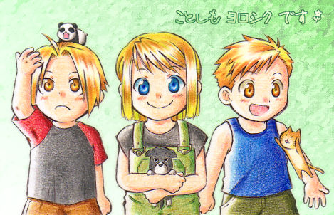 2006年の年賀絵その1。主にオフライン用。 ハガネンガ(笑)4年目!戌年だしウィンリィかリザよねって事で 最初に戻ってリゼンブール幼馴染ーズ。趣向を変えてちびっこ。 そして鋼といえば動物の多さ。デンだけでは何なので色々描いてみました♪ 服の色は現在の3人を参考に決めました。アルはちょっと失敗こいたかなー。