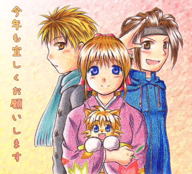 2006年の年賀絵その2。主にオンライン用。 moo系サイトとして軌道に乗ってきたし今度こそmoo系を用意しよう!って事で。 やはりメインは自分らしくデバイスで。やはり干支分は悠久のテディで(笑)。 十夜と誠志郎の服はその頃大ハマリしてた某パソゲーより拝借しましたv 描いてみたらセンターオーパスの色とも一致してて何か嬉しかったり。