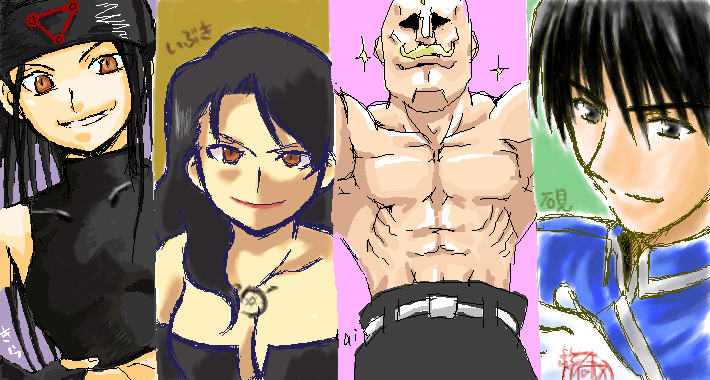 エンヴィー:水瀬きら様 ラスト:もへ アームストロング:藍様 マスタング:硯様 この日3枚目な訳ですが…皆さん上手でもう如何したら!(アワワ) 出来上がった時は凄い達成感。壮観でしたよ…!参加させて頂き幸せ!! 描いてと言われて本当に描いてくれた藍さんは神だと思います。 ピンク!ピンク!