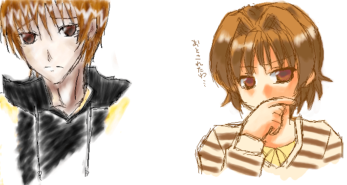 恵:緋智様 忍:いぶき という訳で此花絵茶!まさか此花で合作が出来るとは☆ しかしめでたいのに何故か2人とも表情がめでたくないよ(笑)。