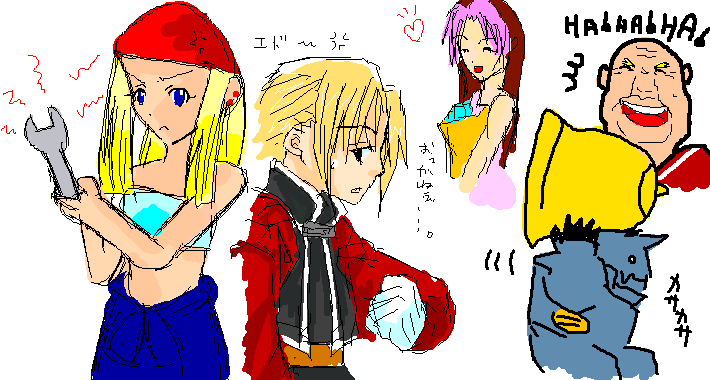 ウィンリィ、ロゼ、コーネロ:ぁゅ様 エドワード:水瀬きら様 アルフォンス:もへ 初の鋼絵茶♪因みにMASK機能が使用出来るようになりました(嬉)。 そんな訳で、試しを兼ねてベタ塗で第2話の最萌ポイント描きましたw って言うか皆ここぞとばかりにベタ塗だね!?